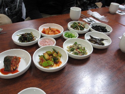韓国はとりあえずこんな感じで小皿の料理がズラッと並べられる。お代わり自由課金なし。