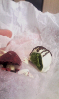 隣の黒いピンクは、イチゴチョコにココアクッキー砕いたやつを混ぜて固めたやつ。
